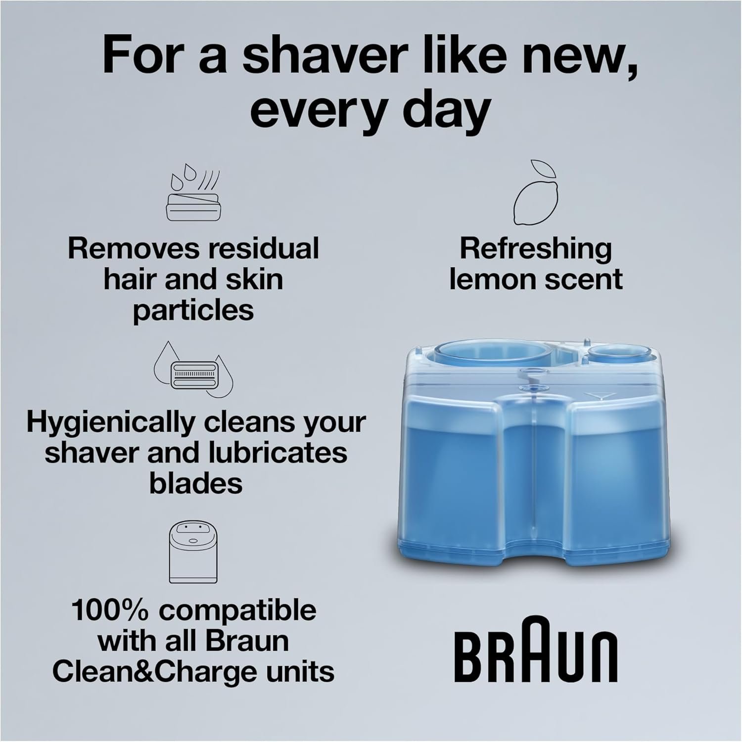 The Braun Clean & Renew Cartridges work with any Clean&Charge unit to give you a fresh, clean and hygienic shave every day