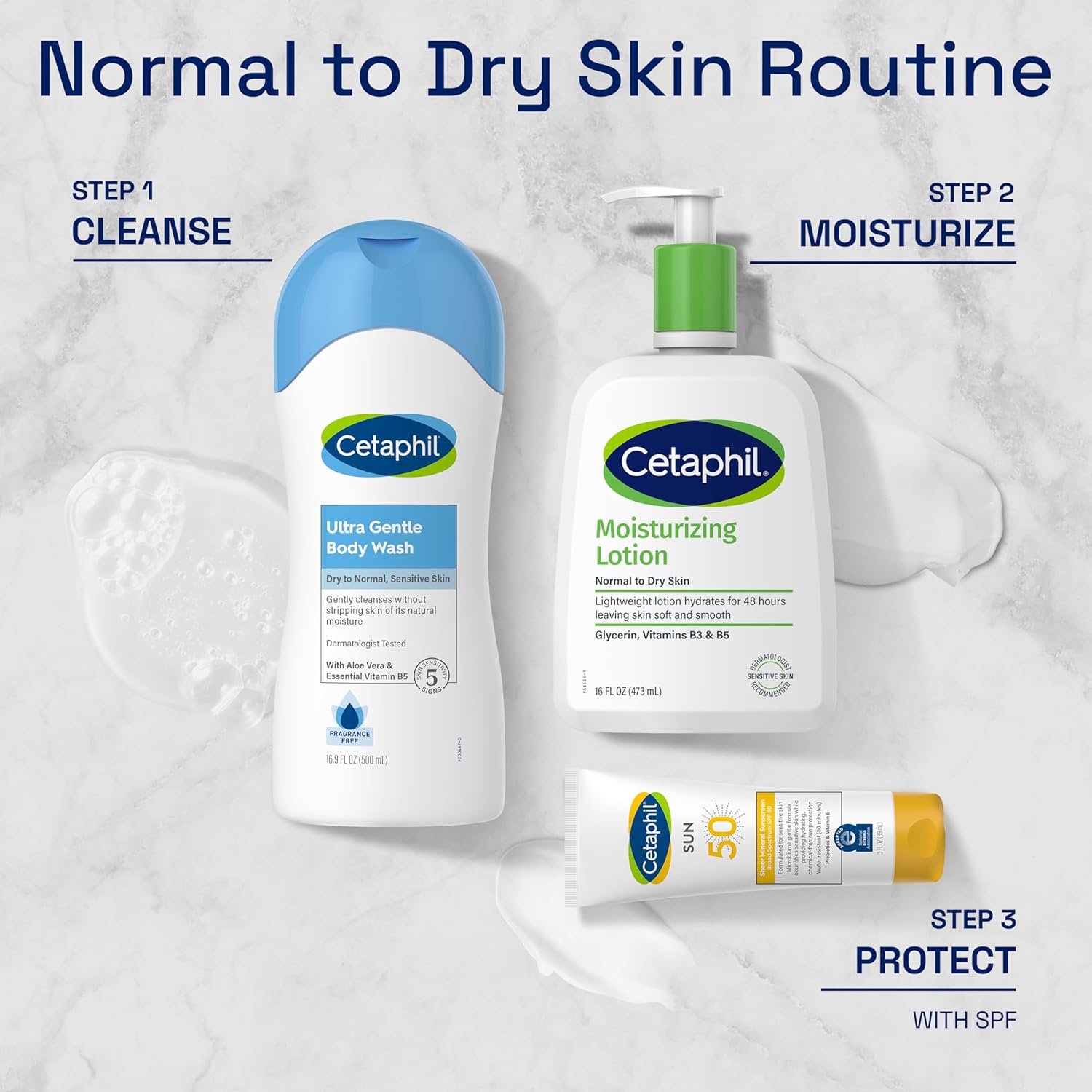 Find skin care that works for you with CETAPHIL Moisturizing Lotion, a lightweight and fast absorbing face & body moisturizer designed to comfort and hydrate all skin types. The unique formulation of skin essential vitamin E and 6 moisturizing ingredients provides instant lightweight hydration that leaves skin soft and smooth. And now formulated with a new blend of key ingredients: hydrating glycerin, panthenol (vitamin B5) to hydrate, soothe and preserve the skin barrier, and niacinamide (vitamin B3) to help smooth skin texture and retain skin moisture barrier. Water binding agents deeply replenish the skins moisture and prevent moisture loss, providing long lasting 48 hour hydration that completely restores the skins moisture barrier in one week, helping to defend against 5 signs of skin sensitivity. Fragrance free, lanolin free, paraben free and sulfate free, this gentle lotion is clinically tested for even the most sensitive skin. Treat your skin right thanks to the gentle, non-comedogenic formula, providing instant, everyday moisturizing care that leaves skin immediately feeling soft, smooth and replenished.