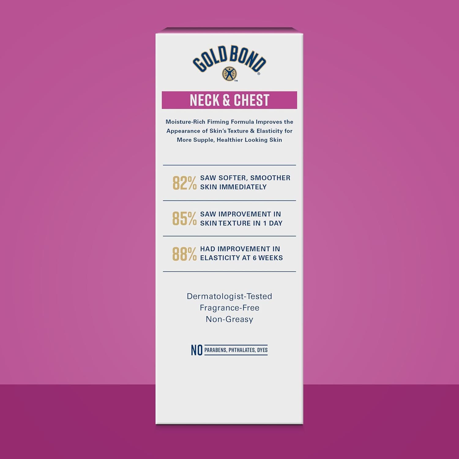 When you look in the mirror, does your neck and chest area give away your age? Gold Bond Neck and Chest Firming Cream contains hyaluronic acid and visibly firms neck and chest skin to reveal youthful-looking skin. Your neck and chest area have different skin from the other skin on your body, and this formula works on this delicate area to help visibly improve elasticity and firmness. Specially developed to help nourish aging skin, this body cream features a blend of key ingredients to provide long-lasting hydration. Best of all, it’s clinically tested, dermatologist tested, hypoallergenic, fragrance-free, nongreasy and fast-absorbing.