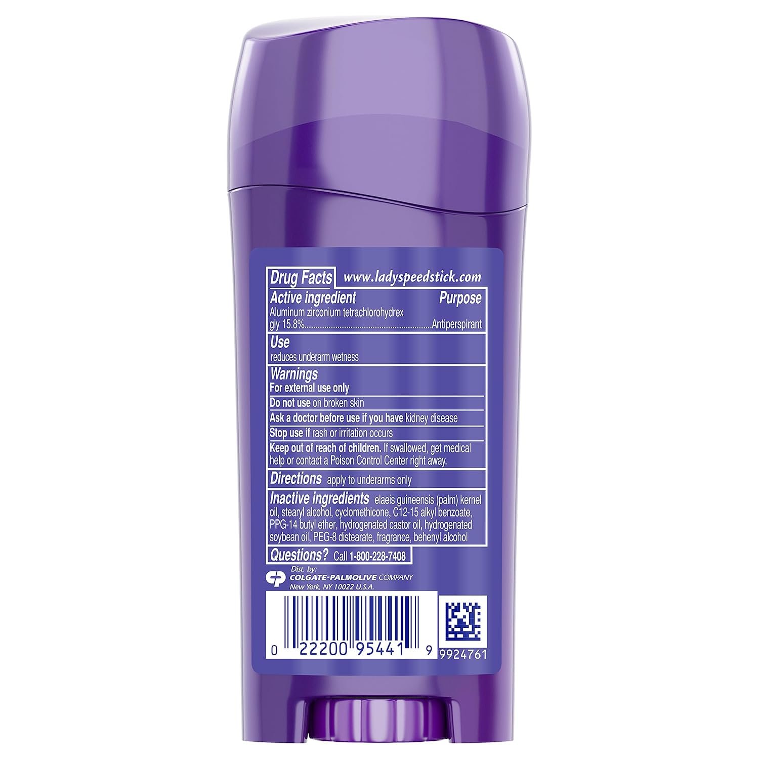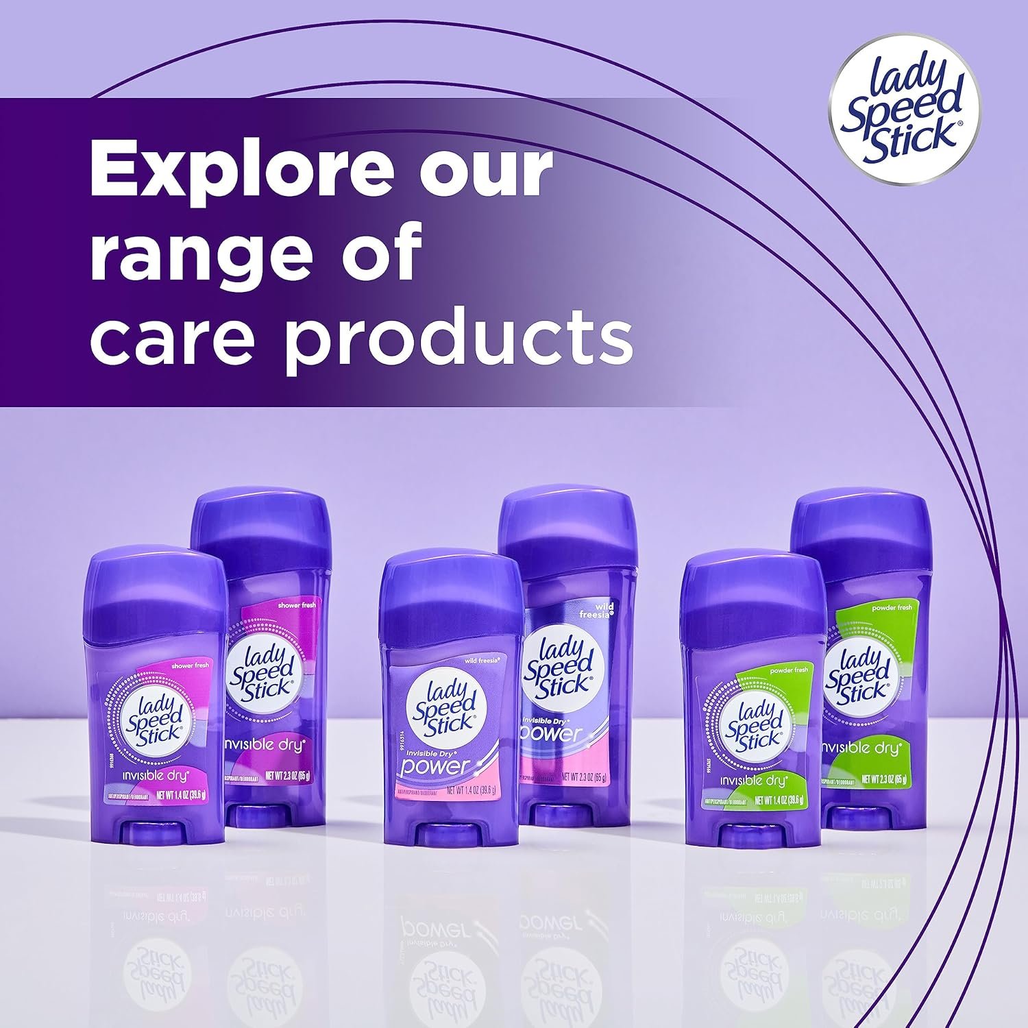 Feel fresh, confident and unstoppable with Lady Speed Stick Invisible Dry Antiperspirant Deodorant stick. This Lady Speed Stick antiperspirant for women provides 48-hour odor and wetness protection for maximum confidence. Lady Speed Stick Invisible Dry Antiperspirant Deodorant is a solid stick with a sheer application that reduces underarm perspiration. The powerful fresh scent of this deodorant for women will help you smell great and feel confident all day. Lady Speed Stick Invisible Dry Antiperspirant Deodorant provides 48 hour odor and wetness protection so you can feel fresh and dry all day. These antiperspirants for women provide a sheer application and reduce underarm perspiration. Feel confident to take on the day. The Lady Speed Stick line of women’s deodorants and women’s antiperspirants come in a variety of scents and benefits. These include Invisible Dry, Power, Zero and Stainguard variants. Lady Speed Stick Invisible Dry antiperspirants provide a sheer application and reduce underarm wetness. Lady Speed Stick Power antiperspirants provide 48 hour odor and wetness protection. Lady Speed Stick Zero deodorants are free from aluminum, alcohol* and parabens so you can smell and feel great all day. Try them today to find the right deodorant and antiperspirant for you. Feel fresh, confident and unstoppable with Lady Speed Stick. * does not contain ethanol Lady Speed Stick deodorants and antiperspirants should only be applied directly underneath the arms. Remove the cap from the product. Turn the dial on the bottom clockwise to raise the deodorant or antiperspirant stick so that it is protruding from the container. Simply rub the deodorant or antiperspirant directly on the armpit and replace the cap.