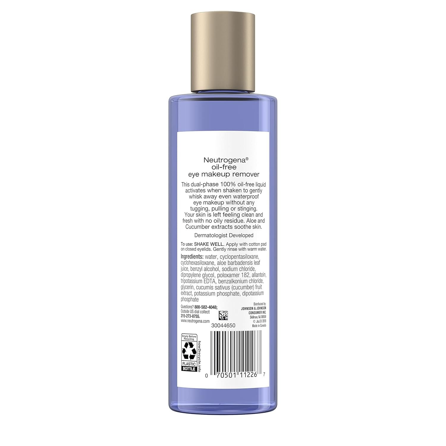 Neutrogena bottle of dual-phase 100% oil-free liquid eye makeup remover and makeup cleanser formulated with soothing aloe and cucumber for sensitive eyes