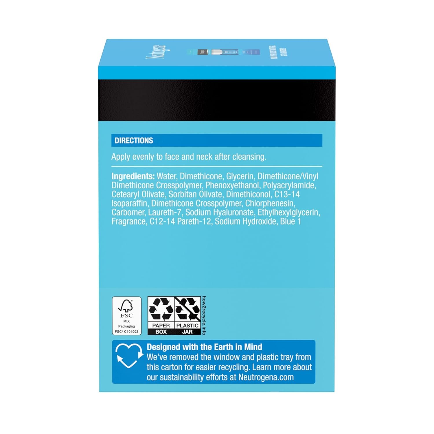 1.7-ounce jar of Neutrogena Hydro Boost hydrating water gel daily face & neck moisturizer with hyaluronic acid to hydrate dry skin. Designed with the Earth in mind. We’ve removed the window & plastic tray from this carton for easier recycling