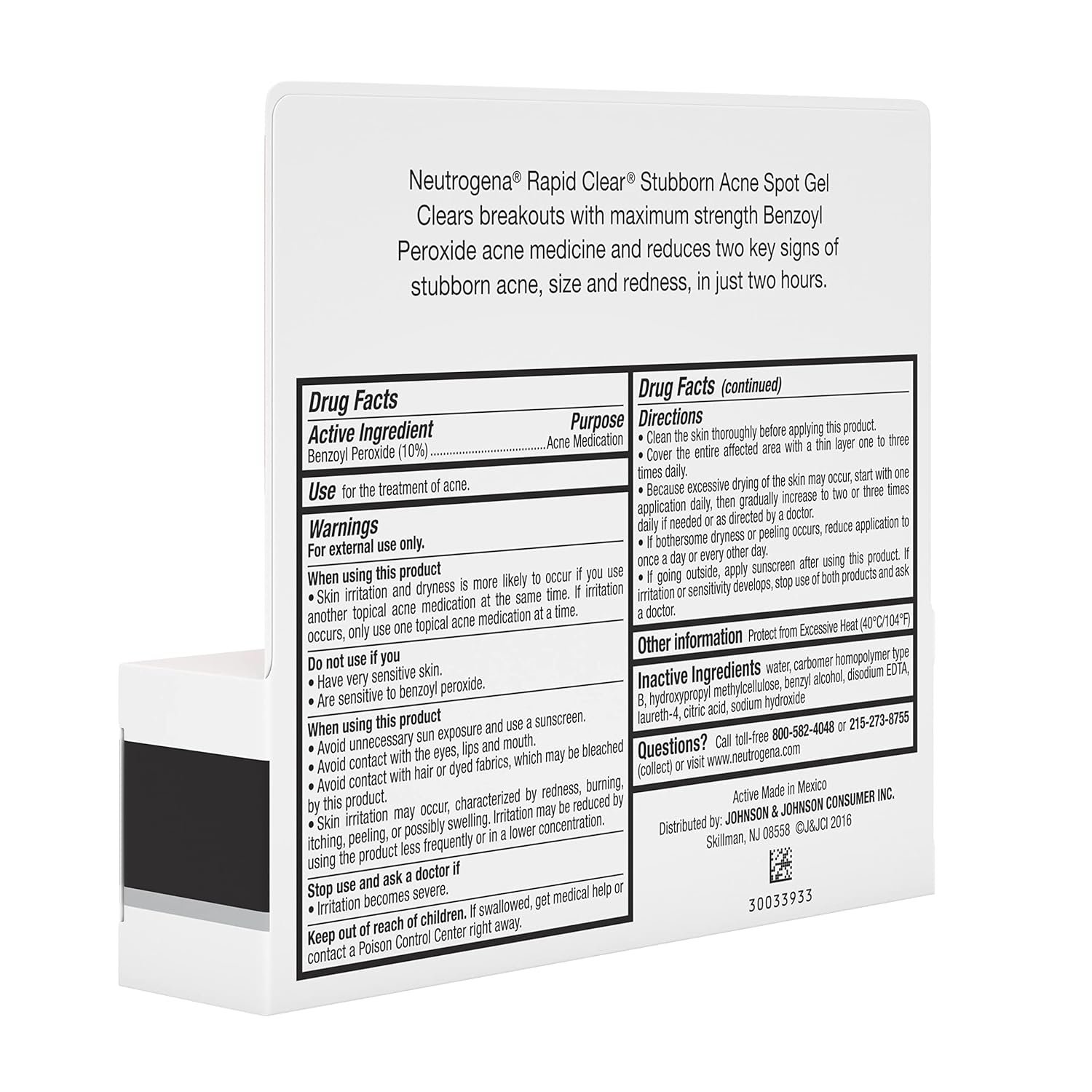 Visibly reduce the appearance of acne and achieve clearer-looking skin with Neutrogena Rapid Clear Stubborn Acne Spot Treatment Gel with benzoyl peroxide. From a dermatologist recommended brand, the maximum-strength acne-fighting formula of this pimple spot treatment is clinically proven to rapidly reduce the size and redness of stubborn acne in just two hours. The effective gel formula contains 10% benzoyl peroxide, the acne medication dermatologists recommend most for clearer skin without a prescription, it treats acne pimples and helps prevent future breakouts. Designed for acne-prone skin, this daily spot treatment provides continuous improvement of acne blemishes throughout the day and can be applied up to 3 times a day. Help minimize the appearance of acne pimples and breakouts with Neutrogena Rapid Clear Stubborn Acne Spot Treatment Gel.