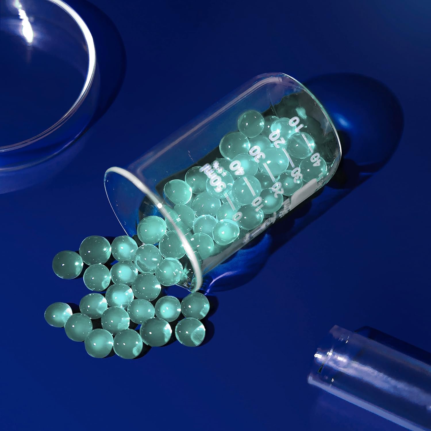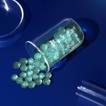 Image of glass container with green caviar spilling out onto deep blue tabletop with beakers nearby.
