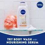 Includes one (1) 20 fluid ounce bottle of NIVEA White Peach and Jasmine Body Wash with Nourishing Serum