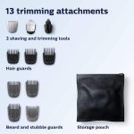13 pieces for all of your grooming needs: Beard and stubble trimming and maintenance, precision trimmer allows exact placement for sharp lines, nose and ear trimmer taking care of unwanted hairs