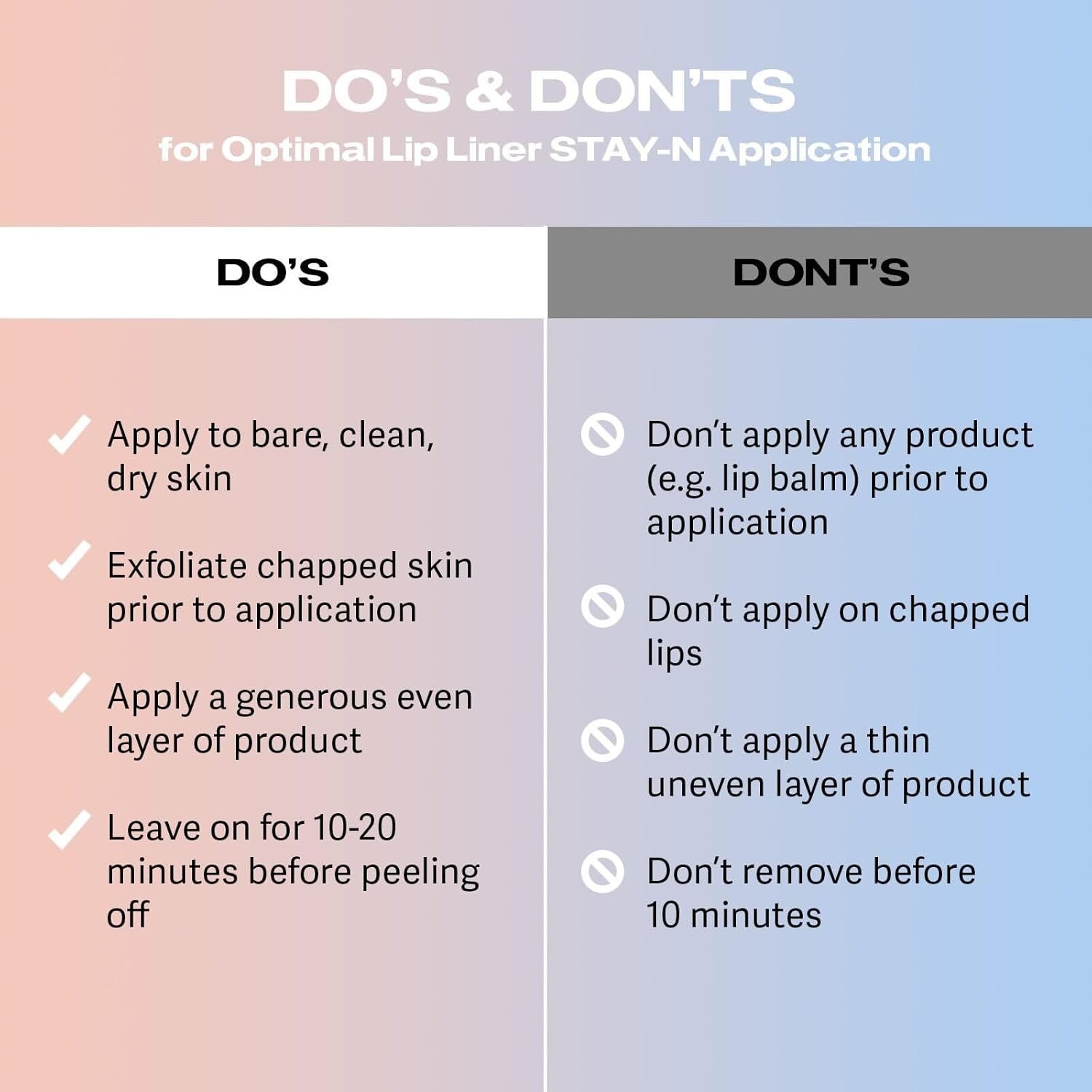 INSTRUCTIONS – Trace along the lip line with a generous, even layer. Leave on for up to 20 minutes. After the formula has set, slowly peel the film tint off to unveil a smudge-proof, semi-permanent lip color! TIP: DO NOT USE ON DAMAGED OR BROKEN SKIN. Lip Liner STAY-N works best on clean, exfoliated, dry skin.