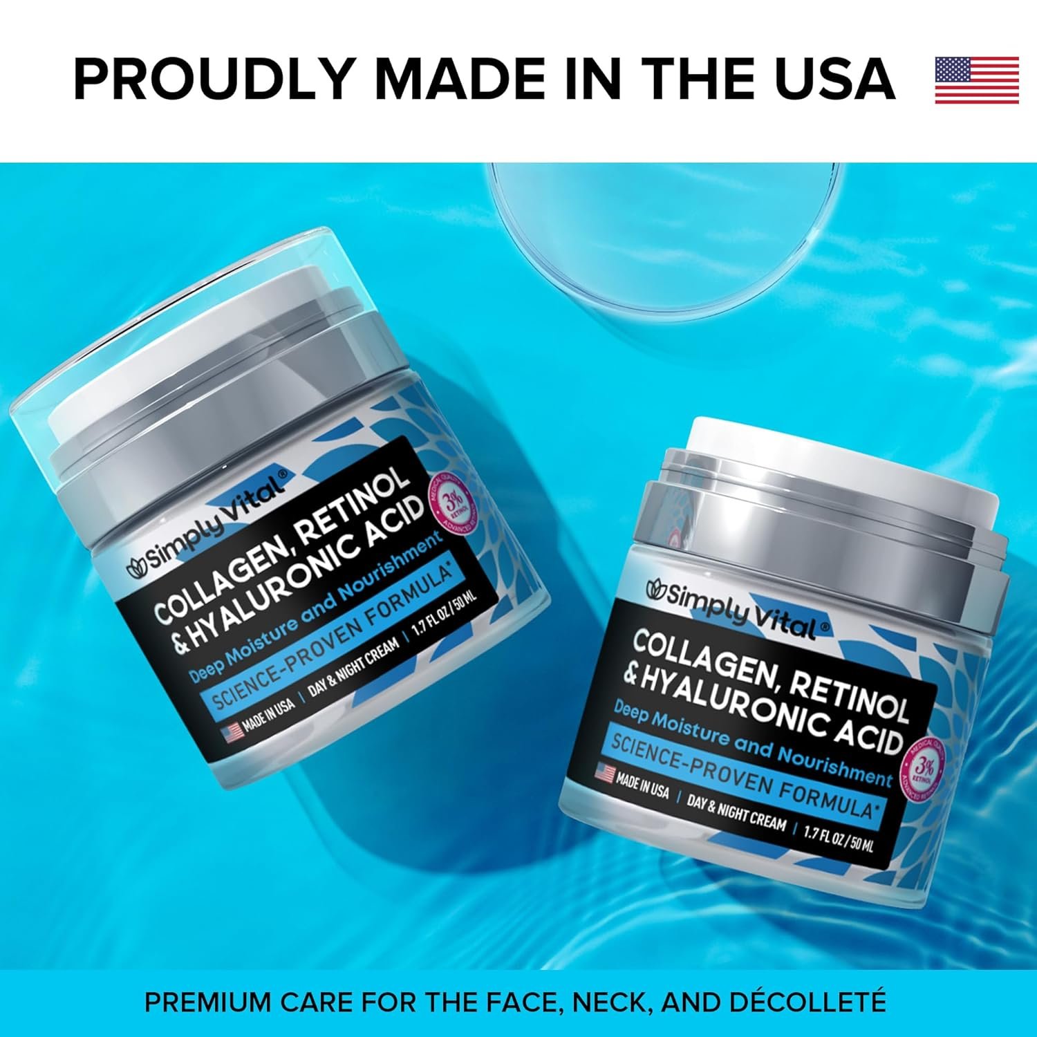 Premium Face Cream Made In USA – SimplyVital ensures the highest quality of each bottle of retinol moisturizer we produce. We always choose the most powerful and gentle natural formulas, so you can always get what your skin truly deserves and let your natural beauty shine. Our skincare products are made in USA GMP-certified laboratories with the highest manufacturing standards.