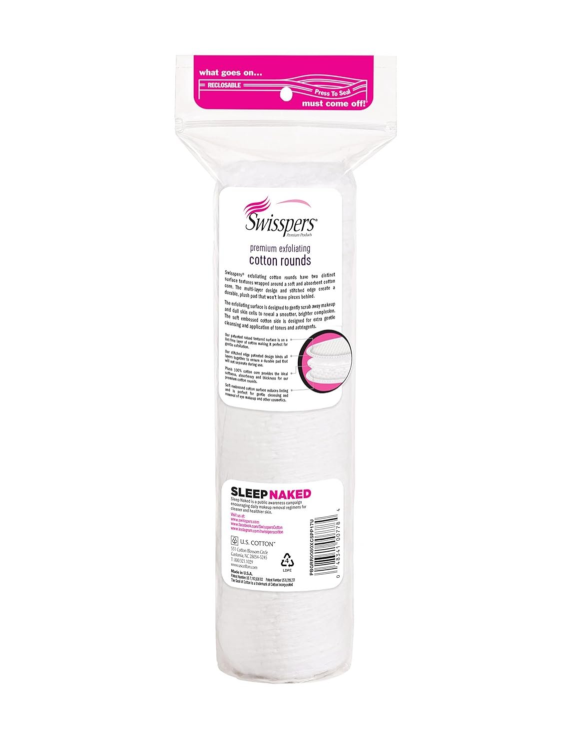 Size: 80 rounds | Style: Exfoliating Rounds. Swisspers Premium Exfoliating Rounds, 2 Distinct Raised Textured Surface, Cotton Facial Pads, 80 Count re-closable bag. Gently scrub away makeup and dull skin with our premium 100% cotton rounds. One side features a micro-bead surface for soft exfoliation, while the other side is embossed for light cleansing and applying lotions or astringents.